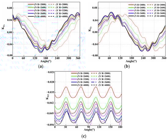 In this section, the cavitation number  and oblique angle  are used to analyze the influence of the PJP rotating speed. The bearing force comprises the transverse force , vertical force , and axial force . Figure 12 shows the changing trend of the bearing force with different rotating speeds under the cavitation condition (N) and non-cavitation condition (Y). Under the no-cavitation conditions, Figure 12a shows that for the different rotating speeds, the transverse force  only differs in the peak value and there is no phase difference. In contrast, under the cavitation condition, there is not only a difference in the peak values of the transverse force but also a certain phase difference. Moreover, the fluctuation range of the transverse force increases with the rotating speed, and the phase simultaneously shifts to the left. As shown in Figure 12b, the change law of the vertical force  with the rotating speed is similar to that of the transverse force. The difference between the transverse and vertical forces is only a certain peak phase difference under the no-cavitation and cavitation conditions. The axial force  still exhibits good periodicity under the two conditions (N and Y) regardless of the rotation speed, which is verified by the pressure cloud in Figure 13. The fluctuation range of the axial force under the cavitation condition is relatively smaller than that under the non-cavitation condition. With increasing rotating speeds, the axial force first increases and then decreases after the rotating speed reaches 3200 rpm. The conclusion is consistent with Figure 10a.