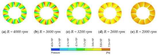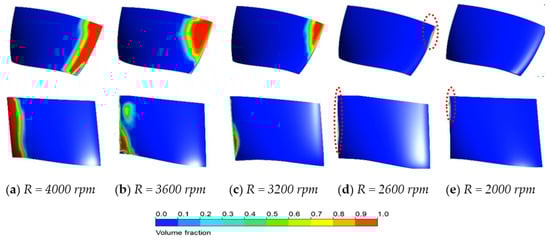 Figure 21 shows the velocity of the rotor blade tip at different rotating speeds when . The figure shows that the pressure difference between the pressure and suction sides of the rotor blades gradually increases, and the thrust provided by the rotor blades also increases, proving that the total thrust increases under the high rotating speed condition (R = 4000 rpm). Generally, the velocity is higher near the leading edge of the blade tip, which is mainly caused by the rotation acceleration of the rotor blade, while it is lower on the other side. The area of the low-velocity zone significantly increases with the rotating speed. At higher rotating speeds, the fluid of the rotor domain has higher kinetic energy and higher acceleration of the fluid performance, which provides sufficient space for the tip clearance flow energy to develop and transport. Additionally, the generated tip clearance vortex intensity is higher than that under the lower rotating speed conditions; consequently, more low-velocity areas are afforded at higher rotating speed conditions.