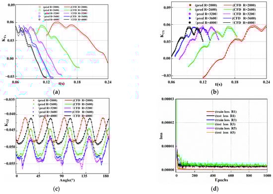 Difference of the bearing force between the predicted value and CFD value. (a) Difference of  at different rotating speeds. (b) Difference of  at different rotating speeds. (c) Difference of  at different rotating speeds. (d) Training and testing losses.