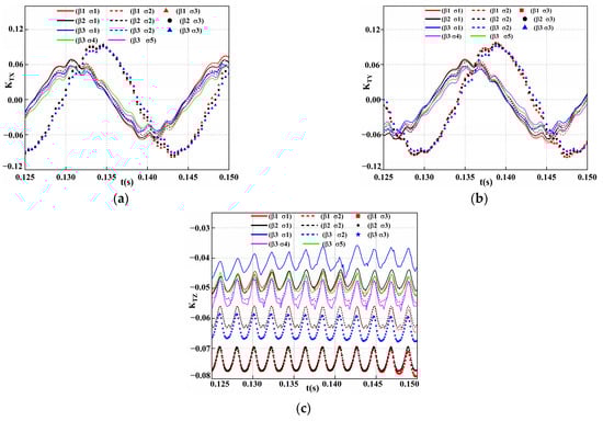 As shown in Figure 16, the cavitation numbers , respectively, are 1.4721, 4.4394, 7.5682, 2.9551, and 5.9225. The oblique flow angles  are , respectively. For the same cavitation number, no phase difference exists in the transverse force peak of a single-rotor blade. The peak difference of the transverse force is relatively smaller than that of pure axial flow when . While at a higher oblique angle of , the peak value of the transverse force is relatively large compared to that of the lower oblique flow angle condition. For different cavitation numbers, the change trends are relatively similar to the pure axial flow condition. The phase and peak difference of the transverse force are relatively small at the lower cavitation numbers  and . At a higher cavitation number , the phase difference and peak value of the transverse force significantly change, where the peak value is larger than the smaller cavitation number  and  conditions. The changing trend of the vertical force  is similar to that of the transverse force at different oblique angles and cavitation numbers; only the phase exhibits a certain deviation. For the same oblique angle, the axial force can decrease with increasing cavitation number. The peak value of the axial force reaches the minimum value for the higher cavitation number . This is similar to the changing trend of the vertical forces: the difference of the peak value is relatively small between  and , and the peak value of the axial force reaches the maximum when .