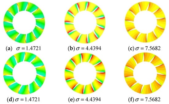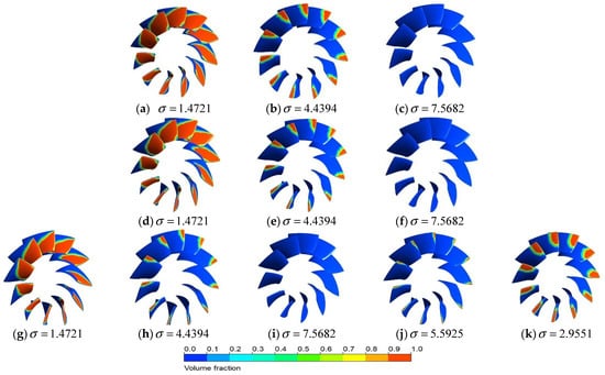 Herein, the rotating speed 3200 rpm is used to study the changing trends of the PJP. Figure 17 shows the tendencies of the water vapor phase volume fraction cloud. For the same , the cavitation area of the rotor blade gradually decreases or even disappears with increasing cavitation number, regardless of the oblique flow angle. At the lower cavitation number , the cavitation area occupies more than half of the rotor blades area, which is extremely detrimental to the propulsion efficiency of the PJP, which is consistent with the situation mentioned in Section 5.1 where the decline in the propulsion efficiency of PJP is very serious. The difference in the cavitation area is relatively small between  and , and the efficiency difference is also small, as shown in Section 5.1.
