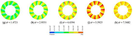 Figure 18 clearly shows that the rotor of the PJP is in a relatively low-pressure area when , compared to that with the other two cavitation numbers, which causes the PJP to be more prone to cavitation. As the cavitation number increases, the cavitation phenomenon gradually moves to the rotor blades tip clearance. Figure 18 shows that the pressure of the rotor blades gradually increases with the cavitation number, and the cavitation area of the rotor blades also continuously reduces with increasing pressure difference of the outlet and saturated vapor pressures. The cavitation area difference is relatively small under different oblique flow angles compared to that under different cavitation numbers. Additionally, the water vapor phase volume fraction is higher at the root of the leaf at a higher oblique angle , signifying that the rotation of the rotor increases the instability of the PJP flow field under high oblique flow angles. This causes the disc surface of the rotor blades to easily form a low-pressure center, which is conducive to the appearance and development of the cavitation phenomenon. The above phenomenon proves the conclusion that the efficiency (shown in Section 5.1) decreases under higher oblique flow conditions.