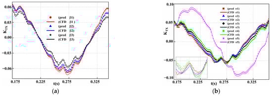 Figure 19 displays the difference between the predicted data and CFD data at different oblique angles and cavitation numbers. The deep neural network model and hyperparameters used here are the same as those in Section 5.2.1. As shown in Figure 19a, CNN-Bi-LSTM not only successfully predicts the trend of transverse force but also affords a better prediction accuracy at the three oblique angles (). The figure clearly shows that the predicted values of the transverse force, except for that at the trough position, are basically consistent with the CFD values. This is because the fluctuation of this value at the other positions is relatively smaller than that at trough position, and the deep learning model can easily learn the relation between different moments. At the trough position, there is a bigger difference between the predicted and CFD values of the transverse force. The prediction accuracy of the oblique flow condition is higher () than that of the pure axial flow condition (). This is because the trough fluctuations under diagonal flow are relatively small. However, the predicted values of the three oblique flow angles are all within the acceptable range. Figure 19b shows the difference between the predicted and CFD values at different cavitation numbers. In Figure 19b, the cavitation number  are 1.4721, 2.9551, 4.4394, 5.9225, and 7.5682, respectively. Overall, the deep model CNN-Bi-LSTM successfully predicts the transverse force at different cavitation numbers. In Figure 19b, the conclusions are similar to those in Figure 19a under the lower cavitation numbers . Under the higher cavitation number , the fluctuation range and change trend of the axial force exhibit a certain difference compared to those under the smaller cavitation numbers. However, the difference between the predicted and CFD values is relatively large compared to the prediction accuracy with the small cavitation number, which is within the acceptable error range.