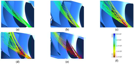 Velocity streamline diagram of the rotor blade tip at different rotating speeds ((a) 2000rpm; (b) 2600 rpm; (c) 3200rpm; (d) 3600 rpm; (e) 4000 rpm; (f) legend).