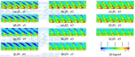 Figure 22 shows the velocity of the rotor blade tip at different oblique angles and cavitation numbers. Clearly, the influence of the cavitation number on the tip clearance flow field is greater than that on the oblique flow angle. Under pure axial flow conditions and  (Figure 22a–c), the low-velocity area of the rotor suction surface increases with decreasing cavitation number. The sufficient mixing of the low-velocity area and the mainstream affects the rotor domain at the lower cavitation number  1.4721, which rapidly decreases the open water efficiency. As shown in Figure 22g–k), the situation improves when the cavitation number is increased to  4.4394, which is consistent with the conclusion of Section 5.1. The change trends under high oblique flow angle () are similar to that under the pure axial flow condition, where the low-velocity regional difference between different cavitation numbers is more obvious under high oblique flow angles condition. For the different oblique angles, as shown in Figure 22a,d,g, the low-velocity area seriously affects the development of the mainstream and the tip clearance vortex core rapidly develops under the high oblique flow angle conditions . Similarly, Figure 23a,d,g shows that the tip clearance fluid fully develops in the rotor area under a small cavitation number. This proves that high oblique flow angles (such as ) and smaller cavitation numbers (such as  1.4721 and  2.9551) are extremely unfavorable for improving the PJP efficiency.