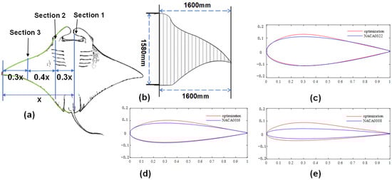 The shape design of the manta ray robot. (a) The schematic diagram of a real manta ray; (b) the scale of the robot; (c) the NACA0022 and optimized airfoils; (d) the NACA0016 and optimized airfoils; (e) the NACA0008 and optimized airfoils.