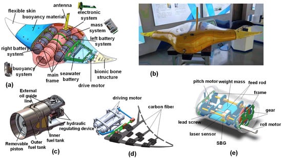 Natural selection has ensured that the mechanical systems that have evolved in underwater creatures are highly efficient concerning each species’ habitat and mode of life [,,,]. Gray’s research in 1936 found that the energy consumed by the dolphin’s body during high-speed swimming is far less than that of dragging a corresponding rigid model []. Creatures such as dolphins and fish have evolved a superior motion performance to that of artificial propeller-propelled vehicles []. Since the world’s first bionic fish ROBOTUNA was made public in 1994 [], scientists have conducted extensive research on bionic robotic fish [,]. Rus and Tolley [] discussed developments in the emerging field of soft robotics, inspired by a range of biological systems. Faheem Ahmed et al. [] provide a detailed overview of the development of soft robotics. A multi-material bio-inspired octopus robot for synchronous underwater swimming and a soft bioinspired frog robot (EXPOG) capable of synchronous underwater swimming were presented in [,]. A comprehensive survey of current research in biomimetic underwater robots and soft robots was presented by Wang et al. [,]. It is supposed that biomimetic underwater vehicles will play an essential role in aquatic environment exploration and resource utilization.