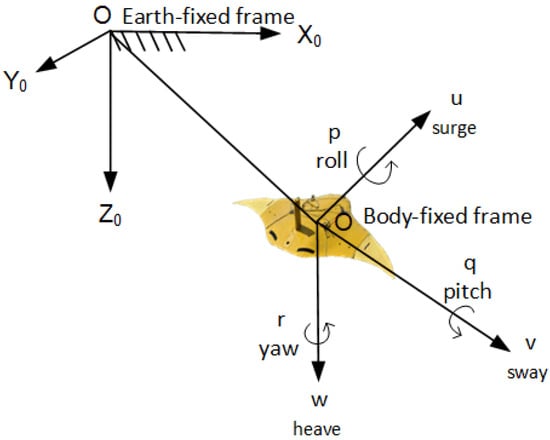 To describe the motions of the manta ray robot in six degrees of freedom (DOF), we used six independent coordinates (Table 2) to represent the position and attitude. The six DOF movements of the prototype were surge, roll, and heave, which refer to the longitudinal, sideways, and vertical displacements, and roll, pitch, and yaw, which describe the rotations about the longitudinal, transverse, and vertical axes. The general motions of the manta ray robot could be described by the flowing vectors: , , and , where denotes the earth-fixed position and attitude vector, denotes the body-fixed linear and angular velocity vector, and is used to describe the forces and moments acting on the robot in the body-fixed frame. We picture the body-fixed and inertial reference frames in Figure 3.
