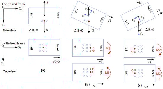 The force analysis diagram of the robot gliding up and down. In the charts, the red dots indicate the locations of the centroid, the black dots represent the locations of the center of buoyancy, and the white dots denote the possible locations of the centroid. The red dotted lines indicate that if the centroids move from the red dots to the green ones, the red curve moments will form. (a) Force analysis diagram of the robot when it is stationary. (b) Force analysis diagram of the robot when it is gliding down. (c) Force analysis diagram of the robot when it is gliding up.