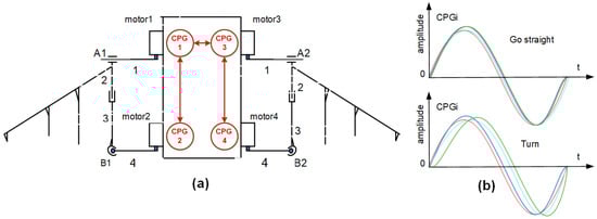 The pectoral fins are driven by CPGs, which are implemented as a network of coupled nonlinear oscillators [,]. Figure 5a shows the topology of the CPG network and the behavior of the output of each oscillator during flapping propulsion. There is a single oscillator for each motor. The first oscillator (CPG 1) is the one that drives motor 1, oscillators 2–4 drive motors 2–4 (Figure 5a). Each oscillator is implemented as a phase oscillator denoted by three equations as