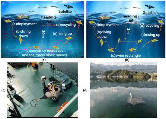To verify the gliding and flapping propulsion performance of the biomimetic manta ray robot, we conducted the gliding and flapping propulsion experiments in a natural environment. The performance of the buoyancy system and the mass-adjustment system were verified during the gliding experiments. Similarly, the fixed-depth flapping experiment demonstrated the high maneuverability of the flapping propulsion system. We show the procedure and setup of the experiments in Figure 6. It should be noted that the rectangle mentioned in the text is not a precise rectangle.