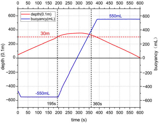 The depth and buoyancy changed with time. The red dot line denotes the target depth of 30 m. The picture shows the prototype glide to the target depth of 30 m and then float up to the surface. The buoyancy was set to −550 mL and 550 mL when gliding down and up, respectively.