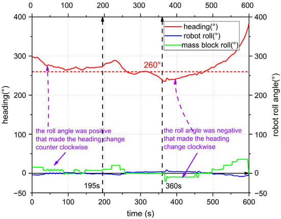 The heading, robot roll angle, and mass block roll angle changed with time. The dotted red line denotes the reference heading was 260°.