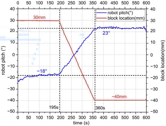 In Figure 7, the buoyancy-adjustment system changed buoyancy to negative 550 mL, and the robot glided down to the target depth of 30 m from 0 s to 195 s. Then it adjusted the buoyancy from negative to 550 mL, which drove the robot to glide to the surface from 195 s to 600 s. This progress verified the performance of the buoyancy-adjustment system. In Figure 8, the reference heading was 260°, the robot heading was 300° at the beginning, and it gradually approached the 260°. We could see in Figure 7 that the prototype was gliding upward from 400 s to 450 s, and the heading angle was about 250°, the mass block’s angle was negative, and the robot roll angle was positive, so the heading gradually tended to 260°. The course changed quickly from 195 s to 360 s because the prototype was in the transition process (Figure 7). In Figure 9, the mass block moved to −30 mm and 40 mm, and the pitch angle was changed when the robot ascended and descended. Thus, the capability of the mass-adjustment system was verified.