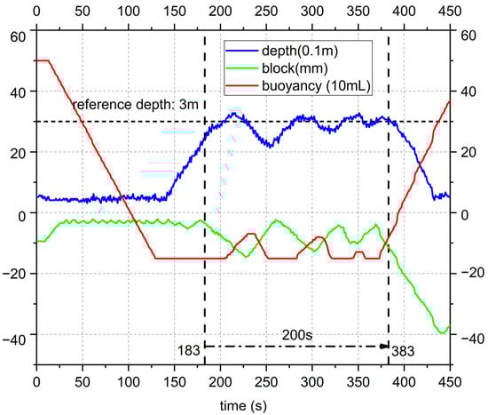 In Figure 10, the blue, green, and red lines denote the depth, the mass block location, and the buoyancy change with time while the robot swam the rectangle. The blue line shows that it swam from the surface to the target depth, swam the rectangle at the depth of 3 m between 183 s and 283 s, and then the robot swam to the surface. The green and red lines demonstrate the mass block, and buoyancy adjustment to keep the depth.