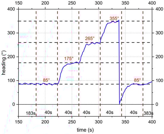The heading changed with time when it swam the rectangle, it swam stably for 40 s for each side of the rectangle, and the reference headings were 85, 175, 265, and 355°, respectively.
