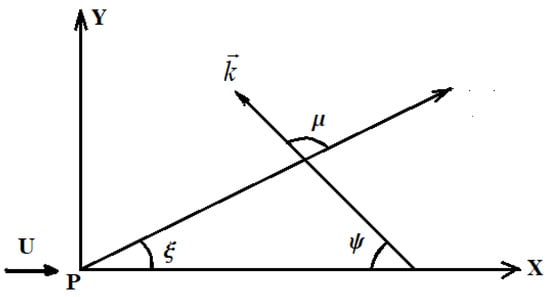 We’ll analyze stationary waves behind a ship at a finite water depth in the presence of a horizontal shear flow. The geometric scheme of the problem is shown in Figure 1. Surface waves with a wavenumber vector (see Figure 1), form the ship’s wake, in the presence of a shear flow , which varies linearly with water depth z. The moving frame of reference is connected with the ship fixed at its beginning (P) flown around by a uniform flow moving in the positive direction along the X axis. is the ship’s speed relative to the moving water surface, is the horizontal vector of a shear flow gradient. We also assume the approximation of an incompressible and inviscid fluid.