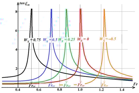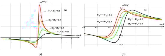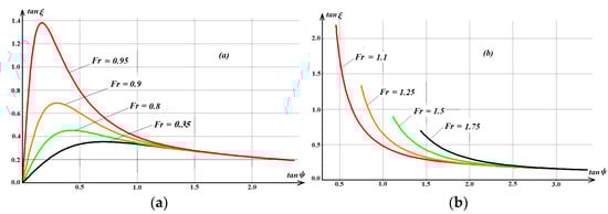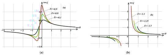 We will consider only positive values of since this equation is invariant under the transformation: Typical patterns of ship waves directions depending on the ray angle for different Froude numbers and shear flow gradient are shown in Figure 6a,b. The dependence is clearly asymmetric about the X-axis; therefore, we presented the entire range of variation . In the subcritical region () there are two systems of waves—divergent and transverse, and in the supercritical region ()—only divergent waves.