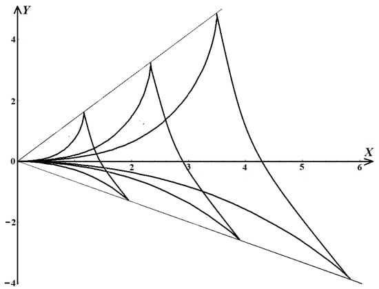 Transverse waves have a negative direction () along the trajectory of the ship. Two wake arms have different angles (see Figure 6a,b). The positive wake arm angle increases with the subcritical Froude number while the negative arm angle is limited by the value. The image of wave crest lines behind the ship can be represented by lines with the same phase of the waves [,] :