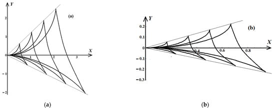 The lines of the constant phase for and different values of shear current: (a) positive gradient components ( ); (b) opposite X- shear gradient components ( ).