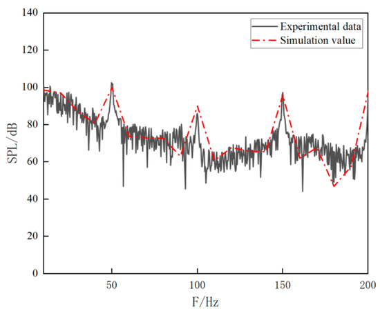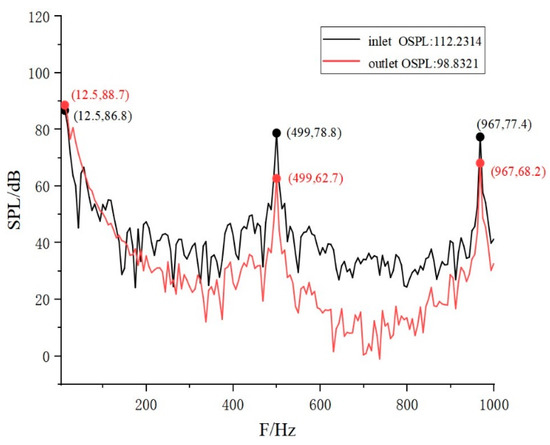 - The general trend of the sound pressure level in the muffler was that with the increase in frequency the noise gradually decreased and finally fluctuated within a numerical range. The higher part of the sound pressure level was in the low-frequency band, and the sound pressure level at the exit monitoring point in the spectrum diagram was obviously reduced compared with the import. This shows that the muffler structure proposed in this paper has certain muffling ability. This provides a reference for the design of a muffler for a pumping system;