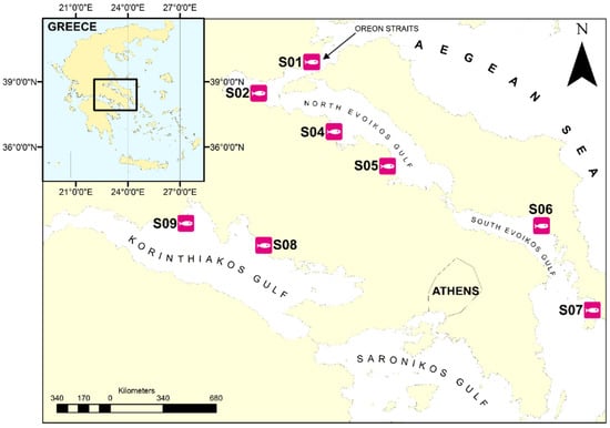 Eight marine cage farm sites in Greece were selected for the collection of physicochemical and geomorphological data coded S01 to S09 (Figure 1). Please note that information from S03 was not used, since this is a coastal shellfish culture farm. All fish farms are coastal cage farms producing mainly European sea bass and gilthead seabream. In addition, specific information per farm such as licensed production, species, and production scheme were collected through face-to-face interviews and questionnaires (Table 1).