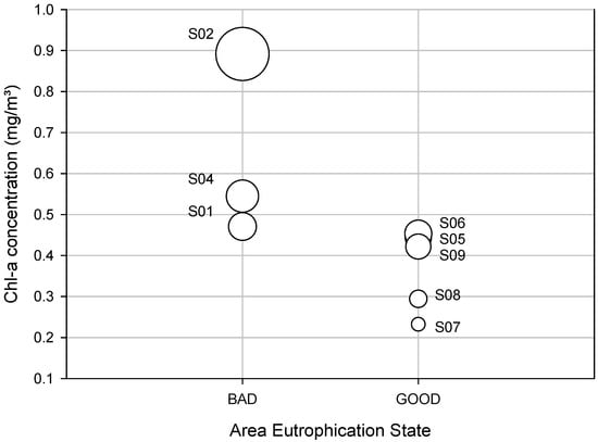 The relationship between the annual state of eutrophication and chl-a concentration shows clearly that the cultivated fish biomass is not a pressure that results in the deterioration of the eutrophication state. This holds for farm S02, which holds on average the largest biomass of the rest. However, much smaller farms such as S01 and S04 have similar chl-a concentrations as other farms with good eutrophication status such as S05, 6, and 9. The smaller farms, i.e., S07 and 8, show good eutrophication status and exhibit the smaller biomass (Figure 2).