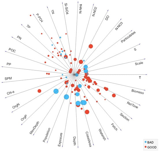 The application of the Bayesian–CHAID algorithm based on the monthly data of all parameters measured allowed the identification of the important parameters which allow for a good eutrophication state and their maximum values above which the eutrophication state changes to bad (i.e., lower or upper eutrophic environment) (Figure 4). These are biomass, particulate nitrogen, salinity, silicates, and suspended particulate matter (SPM) (Figure 4).