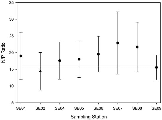 Particulate nitrogen (PN) is one of the two forms of nitrogen in aquatic ecosystems; the other being dissolved nitrogen (DN). It is the form of nitrogen that occurs in plankton, microorganisms, and detritus. Most of the available PN originates in inland waters as a result of the human production of food and energy [] and is transferred to the coastal zones through natural processes such as erosion and storms [,] through a complex relationship of runoff, precipitation, and watershed slope, using the suspended solids as a vector []. The concept that phosphorous is a limiting factor for the freshwater systems was generalized for the estuarine and coastal areas, but evidence has shown that coastal eutrophication is affected by both nitrogen and phosphorous [,], with nitrogen being the more important factor of the two and phosphorous being a limiting factor []. Moreover, it has been theorized that P is a secondary limiting factor, the first being light, especially in the deeper parts of coastal waters []. The N/P ratio of each sampling station (Figure 4) shows that all stations show statistically similar values of N/P ratio both between them and between the stations and the theoretical Redfield ration of N/P = 16:1, indicating a rather N and P replete state (no stress) []. Figure 5 shows that even though there exists this statistical similarity among stations, the overall eutrophication state is different (station 2 is ranked as exhibiting a bad environmental state).