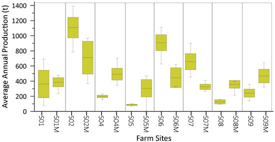 Annual average actual production and the model predictions for each farm site (letter M in y-axis labels denotes the model estimates).