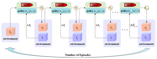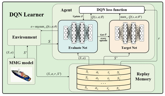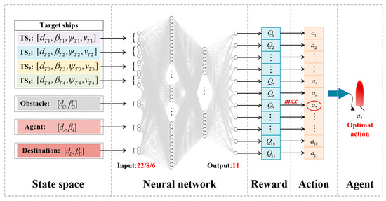 As illustrated in Figure 2, the ship (agent) departs from the initial state and then selects an action that can maximize the future return following the policy . is the set of actions available in the state , represents the probability that if , and is the discount rate. The policy used here is an -greedy policy, which balances “exploitation” and “exploration.” Exploitation means to select an action with the maximal value function, and exploration refers to attempting a possible action randomly, which can prevent the algorithm from falling into a local optimum. The agent will first select and then perform the action to reach the next state and obtain a reward from the environment. The parameter in the policy will be updated according to the reward value. The agent will continue to perform the above process until it reaches the end state . Through extensive interaction with the environment, the agent will obtain a target policy, which only selects the action with the maximal value function and does not explore other actions.