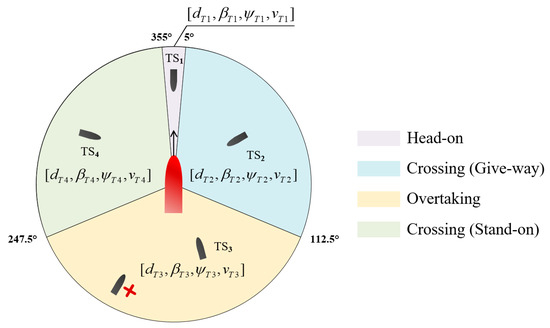 According to the COLREGs, considering the different bearings of the target ship, two ships can face any of three types of encounter situations: overtaking, head-on, and crossing. For target ships from different directions, the responsibility of the own ship (the agent in this paper) can be specified by the illustration shown in Figure 3 [14,40,51]. It should be noted that the coordinate system used here is the xoy system, which is fixed to the agent ship, and the origin is the center of gravity of the agent ship; the detection range is set to 6 NM. Because the agent has different responsibilities in terms of avoiding target ships in different regions, when there are multiple target ships around the agent, we adopt the method proposed in [7] and select the ship closest to the agent in each region as the target for state input. The state can be expressed as Equation (6):