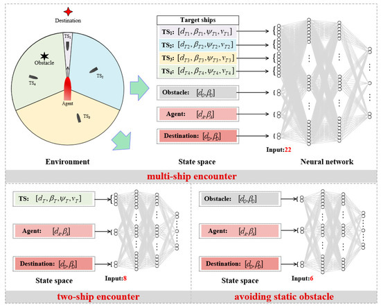In this scenario, the COLREGs do not put any constraint on the movements of the ship and the ship only needs to take effective avoidance action according to the information about the obstacle and the destination. Therefore, the state space of this scenario is composed of three parts: the state of the obstacle , the state of the agent , and the state of the destination . These states are defined in the same way as introduced in the multi-ship encounter scenarios, and there are six elements in the state space.