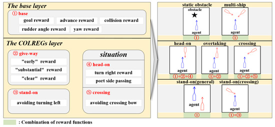 According to the COLREGs, the agents have different responsibilities in terms of target ships from different directions and the selection criteria of avoidance actions are also different. Therefore, we built a set of hierarchical reward functions. The first layer contains the reward functions that need to be implemented in all encounter scenarios, and we defined it as the base layer. The reward functions involved in the second layer need to be selectively executed according to the encounter situation, and this layer is defined as the COLREGs layer. The final value of the reward obtained by the agent is the sum of all the reward functions performed by the agent at the first and second layers.