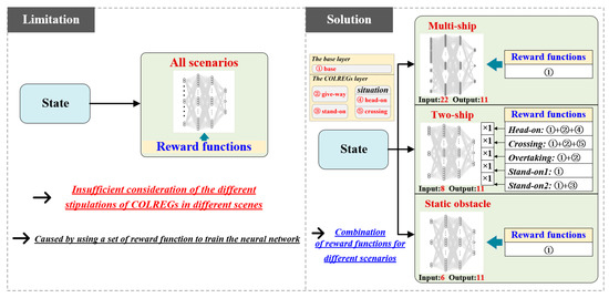 Several studies have been conducted using reinforcement learning methods to create strategies on making decisions that will help avoid collisions. For example, [45,46] adopted the Q-learning algorithm for collision avoidance in a scenario of multi-static obstacles, where the dynamic characteristics of a cargo ship and the water restriction were considered. However, these studies have only focused on static obstacles, not taking into consideration uncertain environmental disturbances. More recently, [19] presented an intelligent method for multi-ship-collision avoidance by combining the deep Q-learning algorithm with expert knowledge. By considering the COLREGs and various encounter scenarios, a series of improved anti-collision decision formulations have been developed based on the DRL algorithm [7,20,47]. In [48], the authors extended the DRL method for shape maintenance and collision avoidance for USV formations in complex navigation conditions. Based on the encounter situations classified by the COLREGs, [49] constructed 19 single-vessel collision avoidance scenarios as training sets for the agent, and a double deep Q network (DDQN) algorithm was introduced to complete the training of the decision model. In addition, since the image tends to contain a lot of information that cannot be simply described by parameters, [24,25] proposed a novel collision avoidance approach by introducing a convolutional neural network in which, instead of a few parameterized indexes, real-time encounter images were the input state of the collision avoidance model. However, most of these studies have adopted a unified set of reward functions to train a single decision network for collision avoidance and lack a comprehensive consideration of the different aspects of the COLREGs for specific encounter situations when designing the reward functions. Meanwhile, it is difficult to ensure the compliance with the COLREGs of the collision avoidance schemes formulated by a single decision network for different encounter scenarios. Thus, the anti-collision decision models based on the DRL method still have a lot of room for improvement.