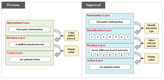 From the above research analysis, it can be concluded that due to its strong self-learning ability, the deep reinforcement learning method has become one of the new choices for collision avoidance research. To address the existing issues in relevant studies, we develop a novel decision model based on the deep reinforcement learning method by categorizing different encounter types. Meanwhile, a hierarchical combination of reward functions is designed that combines navigation safety, the COLREGs, and good seamanship. In addition, a new network construction, training, and decision-making framework for collision avoidance schemes is proposed. This study will lay a solid foundation for the practical application of the reinforcement learning method in the maneuvering of unmanned ships.