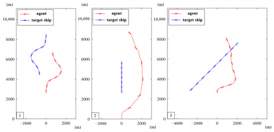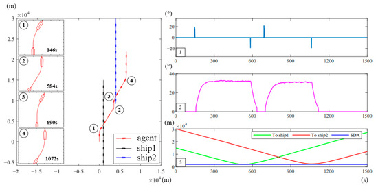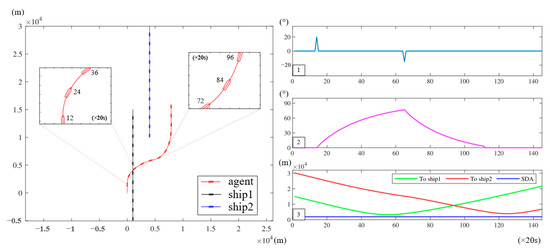 In this case, a more complex simulation experiment involving three ships is designed. The agent is designed to avoid collisions with two target ships simultaneously, while taking into account the provisions of the COLREGs and good seamanship. The initial positions of these ships are set in advance, and if any avoidance action is not performed, collision will be inevitable. The minimum allowable distance between the agent and the other two ships is set to 1 NM.