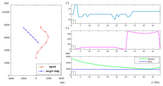 Figure 14 represents the simulation result for collision avoidance during the designed crossing encounter scenario. According to the experimental trajectories, there is a target ship coming from the port side of the agent and the target ship is the give-way ship, while the agent should maintain its initial course and speed. However, as the distance between the two ships reduces, the target ship does not take appropriate action in compliance with the COLREGs. Thus, the agent decides to take effective unilateral actions to avoid collision. In this case, the agent performs a hard starboard so that the collision risk can be mitigated rapidly. Meanwhile, the target ship can easily discern such a large maneuver, which ensures the coordination of operation between the two ships. Moreover, according to the COLREGs, in such a crossing situation, the stand-on ship should take actions to avoid a collision, if circumstances permit, the stand-on ship shall not alter course to port for a ship on its port side. It can conclude that the actions taken by the agent have taken full account of the COLREGs. In addition, the course of the agent changes smoothly, without sudden fluctuations, and eventually returns to the target heading. The agent and the target ship are the closest to each other (i.e., 1949 m apart), at approximately 41 × 20 s, which is larger than the limit value (1 NM).