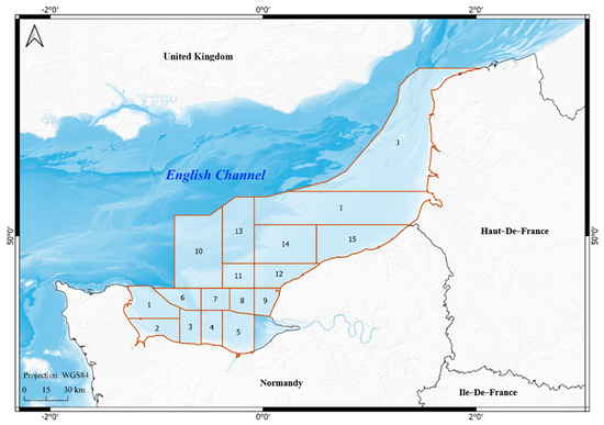 This work focuses on the French eastern coasts bordering the English Channel, from the Pas-de-Calais Strait in the east to the Anglo-Norman Gulf in the West, bordering Brittany. This area covers the coasts of two administrative regions: Hauts-de-France and Normandy (See Figure 1). The geographical location of the English Channel and its morphological, hydrological and biological characteristics create the conditions for an area rich in biodiversity and economic activities [23,24]. This area is significantly affected by HAB events with potentially important economic and social impacts [25]. It has experienced several toxic bloom events over the last thirty years, with toxicity and contamination crises by ASP and DSP affecting several shellfish species, mainly scallops (Pecten maximus). In addition, this area has long been affected by other harmful non-toxic algal blooms, such as Phaeocystis and Karenia mikimotoi, which produce scum that can cause mortality of marine animals by anoxia [26,27].