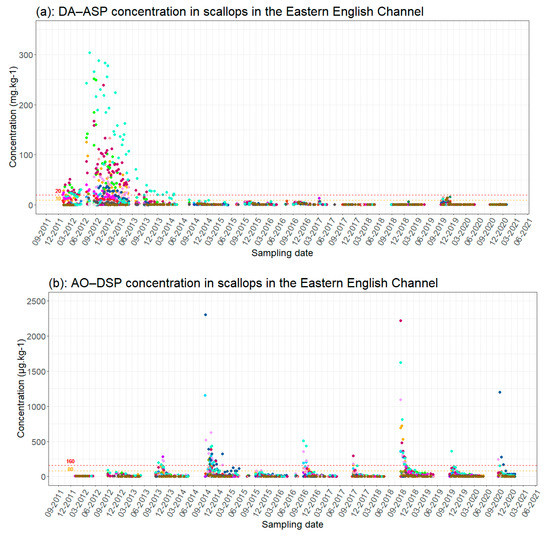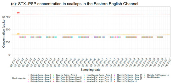 Changes in phycotoxin concentrations in scallops (a) [DA(Domoic Acid) − ASP, (b) OA(Okadaic Acid) − DSP and (c) SXT (Saxitoxins) − PSP] in scallops in the eastern Channel by production area (see Figure 1). Red dotted line = regulatory toxicity threshold; orange dotted line = half toxicity threshold.