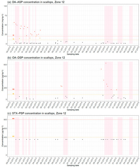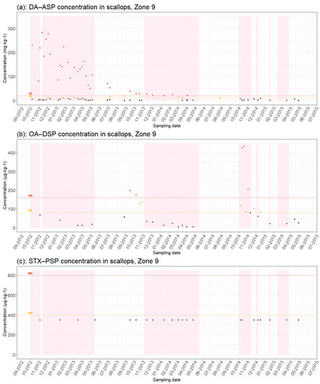 Results of phycotoxin analyses in scallops (a) [DA(Domoic Acid) − ASP, (b) OA(Okadaic Acid) − DSP and (c) SXT (Saxitoxins) − PSP] from production areas 9 from September 2012 to July 2015: Red dots = results > regulatory thresholds; orange dots = results > half regulatory threshold; black dots = results below regulatory threshold; pink background color = closure periods; red dotted line = regulatory toxicity threshold; orange dotted line = half toxicity threshold.