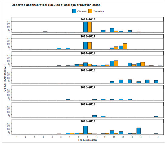 The comparison between the theoretical closures and observed administrative closures was carried out for all the production areas between 2012 and 2019. This comparison again highlighted discrepancies between the durations of the two closures as shown in Figure 5. The results of these analyses provided a complementary vision of management measures in order to better handle economic and social issues associated with HAB.