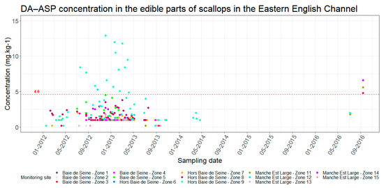 The analysis is based firstly on a study of the evolution of scallop toxicities in the area in order to translate them into theoretical closures. The theoretical closure of a production area is the administrative decision that should be taken when toxicity concentrations of the water or shellfish flesh analyzed at a control point exceed the regulatory thresholds defined by the European regulation [28]. These theoretical closures are then compared with the actual observed closures that occurred by administrative decree. When the concentration of toxins does not exceed the regulatory thresholds, the area should theoretically remain open.