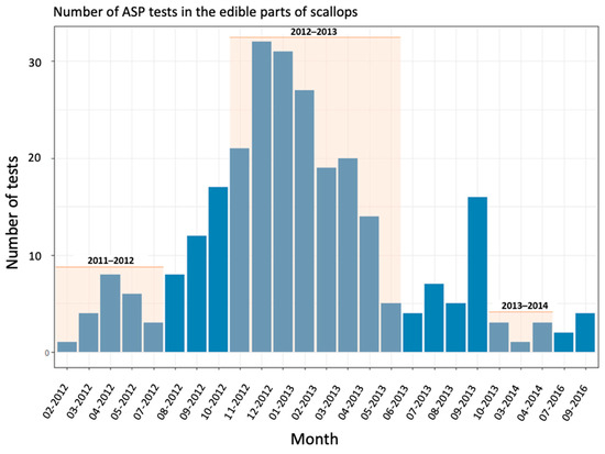 The second case, which accounts for 93% of the data, involves overestimations of closures by the algorithm, mainly between the 2012–2013 and 2014–2015 seasons. This is due to the fact that access to production areas may be open during toxicity periods despite regulatory thresholds being exceeded. This case only concerns ASP contaminations and this measure is implemented under several conditions. When the concentrations of amnesic toxins are between 20 and 250 mg/kg (total drained flesh), a second analysis is made on the edible parts (muscle and gonad). If the result is less than 4.6 mg/kg, the fishery is authorized for shucking industries, otherwise fishing activities are prohibited. Toxicity tests on the edible parts are only implemented if the fishing companies have an economic interest in the shucking industry; they are, therefore, not carried out systematically. Figure 6 and Figure 7 illustrate the concentrations of ASP in the edible parts of scallops and the number of tests conducted per month from January 2012, respectively. They show that related tests for shucking occurred in the first seasons of the analyzed time series (2011–2012, 2012–2013) and in a few months of the 2013–2014 season, with a significant number of tests in 2012–2013 (between 14 and 32 tests per month). After these periods, the number of tests for shucking dropped and no tests were performed after the 2013–2014 season (two tests for ASP concentration in edible parts of scallops were conducted in 2016 (July and September) but this was outside the fishing season).