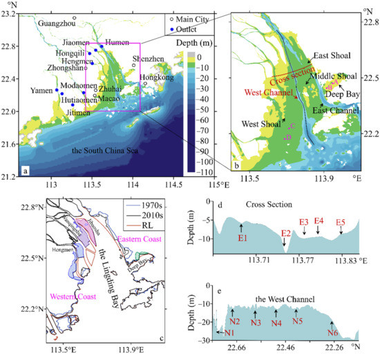 (a,b) Bathymetry of the Pearl River Estuary and the detailed geography of Lingding Bay, (c) the main reclamations in Lingding Bay; the solid lines are shorelines in three scenarios (RL: regulation line, specified by the Pearl River Water Resources Commission of the Ministry of Water Resource), (d,e) the profiles of the sections.