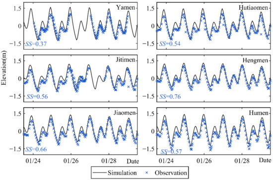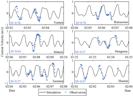 where and are the observed values and modeled values of the water elevation or current velocity. The performance levels of SS are categorized as: >0.65 excellent; 0.65–0.5 very good; 0.5–0.2 good; <0.2 poor [53]. Both tidal levels and currents are highly correlated to the field data with most SS over 0.5, which are regarded as very good performance. Additionally, the few small SS of the currents is still above the acceptable level (SS > 0.2). Consequently, the model results reflect good agreement with the observed values, with acceptable errors.