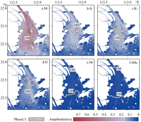 After the harmonic analysis of the tidal currents, constituents M2, S2, K1, O1, M4, MS4 are selected as the main constituents. According to the form factor (F = )/()) of the current velocities, the values between 0.25–1.5 indicate that the currents in LDB are mainly mixed, but dominantly semi-diurnal [54]. The dominant astronomical tide is M2, followed by S2, K1 and O1. The major shallow water tides are M4 and MS4. As shown in the Figure 5, the amplitudes of the astronomical tides increase when entering LDB, due to the convergence of shoreline. The amplitudes of M4 and MS4 are obviously smaller than these of the astronomical tides. In this section, the spatial distribution of the amplitudes and phases of the selected tidal are demonstrated.