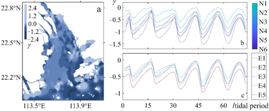 Most of the FVA in Lingding Bay is ebb dominance with negative skewness (Figure 6a). It means that the peak ebb current velocity is higher than the peak flood current velocity. In LDB, a noticeable variation happens between the shoals and the channels, providing the average skewness of about −0.3 and −0.55, respectively. It demonstrates that the water depth is one of the factors affecting the flow velocity asymmetry. Another main factor is the convergent shoreline, which is reflected by the decreasing values and ranges of the skewness from the station N6 to N1 (Figure 6b). In the adjacent sea area, the FVA is also ebb dominance and even more asymmetric. This would be explained by the intrinsic mechanisms in Section 4.1. Moreover, the flood dominance appears in the areas with complex bathymetry, e.g., near the islands.