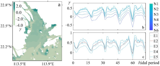 Here, we analyze the spatio-temporal variations of tidal current asymmetries via the gamma parameter proposed by Nidzieko [47], which combines amplitude ratio and relative phase into one parameter. The tidal current velocities and their accelerations are used to compute the total skewness of flow velocity asymmetry (FVA) and flow duration asymmetry (FDA), respectively. The time series of each skewness are analyzed to detect the variation in the research period. Figure 6 and Figure 7 show the spatio-temporal distribution of the asymmetries. It should be noticed that the x axes in the Figure 6b,c and Figure 7b,c represent the number of the full tidal period (~25 h).