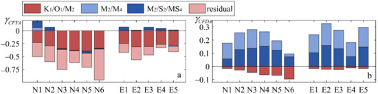 Skewness of the main tidal components, K1/O1/M2 (deep red column), M2/M4 (light blue column), M2/S2/MS4 (deep blue column), and residual current (light red column) of the selected stations (position shown in Figure 1d,e). (a) γCFVA (b) γCFDA.